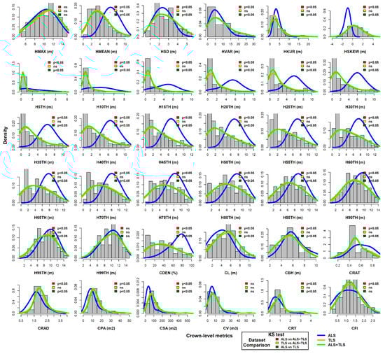 Density plot of the ALS (blue line), TLS (orange line), and ALS + TLS (green line) derived crown metrics. The red, yellow, and green squares represent the Kolmogorov–Smirnov test when comparing ALS vs. ALS + TLS, TLS vs. ALS + TLS, and ALS vs. TLS crown metrics distribution, respectively. The gray histogram is generated using the ALS + TLS crown metrics data. Ns refers to not significantly (p > 0.05) in the two-sided Kolmogorov–Smirnov (KS) test.