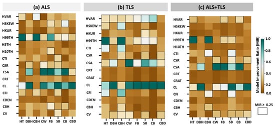 Pearson’s correlation (r) among all the ALS (a), TLS (b), and ALS + TLS (c) derived crown-level metrics (upper triangle) and not highly correlated (−0.9 < r < 0.9) metrics (lower triangle). The “x” resents relationships where the r value is statistically equal to zero (p-value > 0.05).