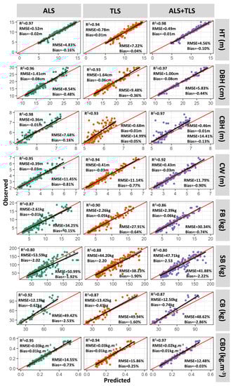 The final predictions derived from the mean of the 500 bootstrap runs were highly correlated to the observed values (R2 between 0.80 and 0.98), with low to moderate errors (RMSE% between 4.56 and 50.99%) and bias close to zero (between 0.03% and −2.86%). By using the ALS data, the model of CBH depicted the highest R2 (0.98), and the model of HT had the lowest RMSE (4.83%). For TLS and the fused dataset (ALS + TLS), the models for HT performed slightly better in comparison to the other modeled tree attributes. By using ALS data, predictions for SB had the smallest R2 value (=0.80) and highest RMSE (51%), but the bias was low. The accuracy for this attribute was higher using the TLS (R2 ≥ 0.88 and RMSE < 39%) and the fused dataset (ALS + TLS). ALS performed better for the HT and CBH models. Accuracies in terms of bias were comparable among models and datasets, with values below absolute 3.00%. Overall, predictions for crown structural and fuel attributes tended to underestimate high values and overestimate low values (Figure 7).