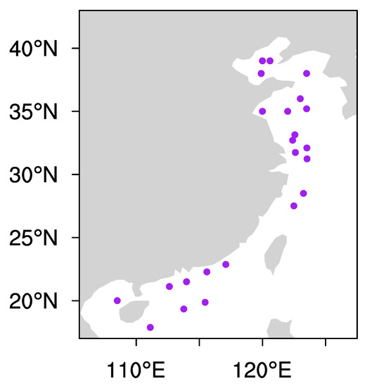The SWH observations from buoys in China’s offshore waters were obtained from the State Oceanic Administration of China (SOAC), available directly from the SOAC office. The wave−height measurements from buoys are available half−hourly. For our analysis, to avoid potential problems related to land contamination [43], buoy observations within 25 km of the coastline were not used. The 23 buoys from which data were collected covered almost the entire coastline of China; therefore, they comprehensively represent China’s offshore waters affected by the East Asia monsoon (Figure 1).