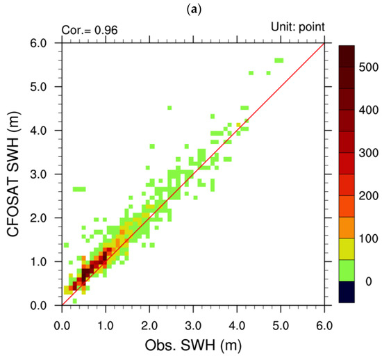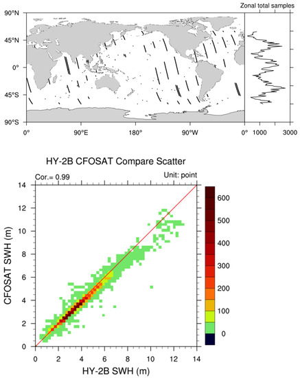An intercomparison of CFOSAT and HY−2B data over a larger domain with over 170,000 points was carried out between 60°S and 60°N (Figure 9a), with the criteria of a spatial window of 50 km and a time window of 30 min [34]. There were three peak zones of a total number of zonal points: one near the equator and the other two near the midlatitude in the northern hemisphere and southern hemisphere. The SWHs from CFOSAT were consistent with those from HY−2B in all SWH ranges, with a correlation coefficient of 0.99 (Figure 9b), which agrees with the findings of Li et al. [31]. It is worth noting that, in calm sea conditions (SWH < 1.25 m), CFOSAT and HY−2B both tended to overestimate the SWH. Similar results were also found in the CFOSAT SWH validation against buoy observations in summer (relatively calm sea conditions) in Section 3.1 and Section 3.2.