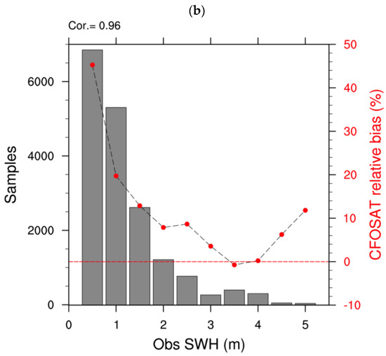 Scatter−point density plot of the CFOSAT SWH versus that of 23 buoys (a) and the relative bias according to the SWH of buoys in intervals of 0.5 m with samples numbers, where red dots indicate the relative bias of CFOSAT SWH against observation (b). The temporal and spatial windows are 30 min and 50 km, respectively, and 21,049 matched SWHs were used.