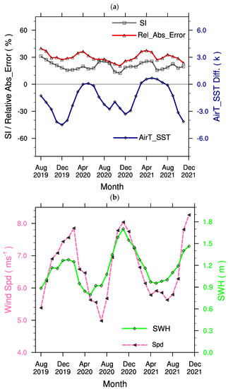 Usually, from October to May, temperature inversions appear mostly in the air–sea interface layer along the southeastern coast of China, in the west and south of the Korean Peninsula, and in the north and east of the Shandong Peninsula [48]. It is worth noting that the RAEs were also relatively low in some high sea−surface wind−speed months. During this period, a relatively low SWH appeared (Figure 3b, green line). The air–sea temperature difference played a key role in the sea−surface roughness [49], especially in April 2020 and May 2021. Also, the seasonal variance of air–sea temperature inversion had an influence on the RAE.