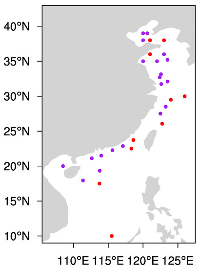 As in Figure 1, but for the HY−2B matched buoy positions. The purple dots indicate the marched SWHs from the buoys that also have matched SWHs with CFOSAT, and the red dots indicate the matched SWHs from the buoys that only have matched SWHs with HY−2B (30 buoys in total).