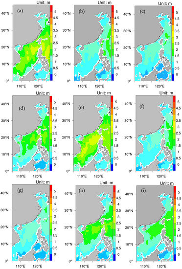 The offshore waters of China are a typical monsoon−affected area that is strongly influenced by the seasonal mean flow, which is notably different in winter and summer [1]. There is a much stronger northeasterly sea−surface wind in winter and a relatively weaker southwesterly sea−surface wind in summer [2]. Sea−surface waves are generated by the properties of the sea−surface wind [3]; moreover, in East Asia, the variance of the sea−surface winds among the seasons leads to variation in the significant wave height (SWH). SWH is the average measurement of the largest third of the waves and roughly corresponds to the mean wave height. This SWH has a close relationship with sea−surface winds [4], with the highest SWHs observed in winter and the lowest in summer. Moreover, the static stability of the atmospheric boundary layer can also influence the SWH [5]. Generally, by affecting the surface winds and static stability of the atmospheric boundary layer, the seasonal mean flow plays a key role in determining SWHs.