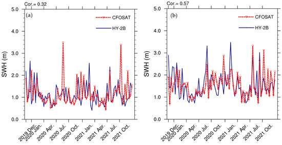 Among the four sea areas, it was interesting to find that the correlation coefficient increased with SWH magnitude. Compared with HY−2B, more extreme high SWHs occurred in northern waters according to CFOSAT, such as in October in Huanghai (Figure 8a), leading to a smaller correlation coefficient. The CFOSAT SWHs varied uniformly with HY−2B to the east of Taiwan (Figure 8c) and in the central South China Sea (Figure 8d).