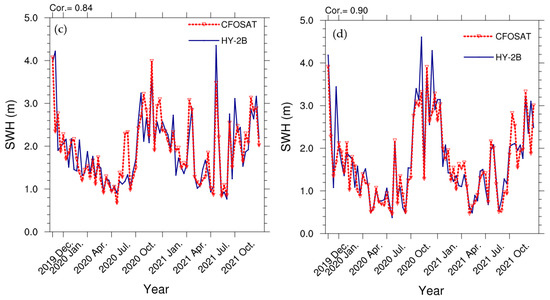 Figure 8 shows the characteristics of the variation in SWH between HY−2B and CFOSAT for every 10−day mean series from December 2019 to December 2021 in the four sea areas of concern (Figure 8a–d). During the study period, the variations of SWH from CFOSAT and HY−2B showed a close relationship (Figure 8a–d), with most of the sea areas having statistically significant correlation coefficients at the 95% confidence level.
