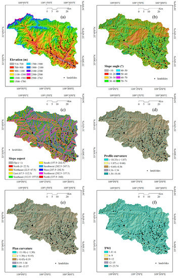 The Topographic Wetness Index (TWI) is also an important landslide conditioning factor, which is utilized to measure the topographic domination over hydrological processes [61]. The TWI values of Zhashui County can be derived from DEM data, ranging from 1.41 to 23.74, which were then further manually reclassified into the following categories: 1.41–6, 6–9, 9–12, 12–15, and 15–23.74 (Figure 3f).
