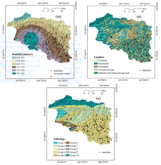 Land use is another conditioning factor frequently utilized to create landslide susceptibility maps [70]. In some agricultural areas, landslides frequently occur due to long-term irrigation, such as in Jingyang County (China) [71]. The land-use types of the study area included farmland, garden land, forestland, commercial land, and industrial and mining storage land (Figure 3n).