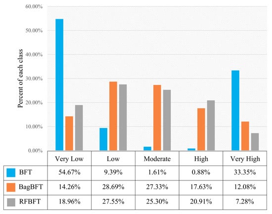 The selected conditioning factors strictly control the accuracy of the landslide susceptibility map. The fifteen factors used in this paper are typically chosen by other researchers and are also highly related to the landslides in Zhashui County. The value of the landslide susceptibility index (LSI) is computed by analyzing the spatial connections of historical landslides and every conditioning factor. After normalization, LSI values between 0 and 1 are obtained. Then, a stepwise forward process is applied to reclassify the LSI values into five classes from very low susceptibility to very high susceptibility on the basis of the natural break classification method [77]. The application of BFT, BagBFT, and RFBFT is summarized in Figure 4, Figure 5 and Figure 6, where each susceptibility map is demonstrated. The area percentage of each class within the three models is illustrated in Figure 7. For the BFT model, the raster pixels are distributed in 54.76%, 9.39%, 1.61%, 0.88%, and 33.35% of the area for the very low, low, moderate, high, and very high classes, respectively. The low class output from the BagBFT accounts for the highest percentage (28.69%) of the pixels. The very low, moderate, high, and very high classes cover 14.26%, 27.33%, 17.63%, and 12.08% of the area, respectively. Additionally, the RFBFT model classifications are 18.96%, 27.55%, 25.30%, 20.91%, and 7.28%, respectively.