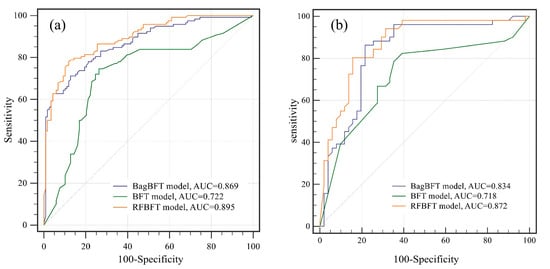 The AUC values for the BFT, BagBFT, and RFBFT models generated by the training dataset are 0.722, 0.869, and 0.895, respectively (Figure 8a and Table 3). It is relevant to note that the RFBFT model has the lowest standard error (0.0199). Thus, both the BagBFT and RFBFT models can improve the accuracy of the base classifier BFT, and the integrated ensemble RFBFT model shows an outstanding performance.
