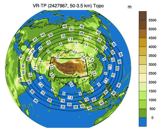 - Zhou, Y.; Zhang, Y.; Li, J.; Yu, R.; Liu, Z. Configuration and evaluation of a global unstructured mesh atmospheric model (GRIST-A20. 9) based on the variable-resolution approach. Geosci. Model Dev. 2020, 13, 6325–6348. [Google Scholar] [CrossRef]