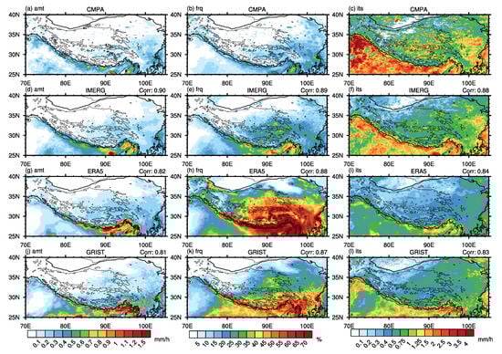 According to Table 3, IMERG still corresponds well with CMPA over the main body of the TP. In terms of MB, IMERG shows less difference over the TP (0.03 mm/h for amount, 4.83% for frequency, and −0.15 mm/h for intensity) than the entire study region (0.04 mm/h, 5.39%, and −0.31 mm/h, respectively). This indicates that, on the one hand, IMERG can generally reflect the spatial pattern of precipitation; on the other hand, CMPA highly relies on satellite data due to the scarcity of weather stations on the main body of the TP. Compared to the MB of the study region, ERA5 exhibits a greater bias of amount (0.1 mm/h) and frequency (28.55%) over the main body of TP, indicating that ERA5’s simulation of precipitation at high elevations is relatively unsatisfactory. In contrast, GRIST exhibits smaller biases (0.08 mm/h for amount, 5.73% for frequency, and −0.3 mm/h for intensity) over the TP. RMSE presents similar features to MB because the three precipitation products generally exhibit consistent differences with CMPA of all grids at altitudes over 2000 m, namely negative bias in intensity and positive bias in amount and frequency. The CORRs with CMPA for all three datasets over the main body of TP are slightly lower than the CORRs over the study region. These results, together with Figure 2 and Figure 3, demonstrate that IMERG and CMPA have comparable spatial properties of TP precipitation. ERA5 and GRIST have moderate wet biases in precipitation amount but significant positive (negative) biases in frequency (intensity), with ERA5 exhibiting the largest biases.