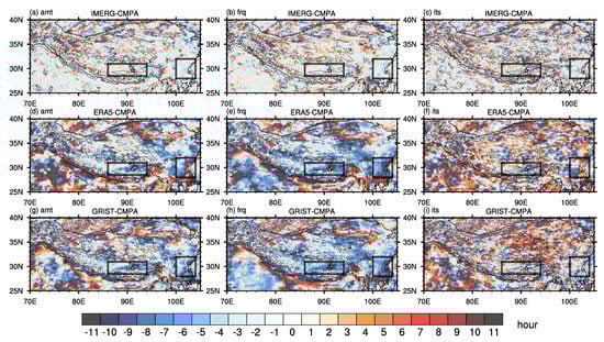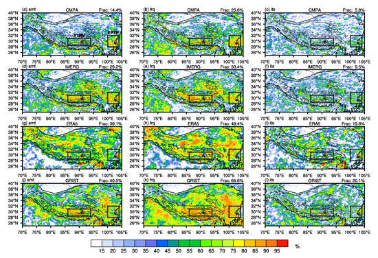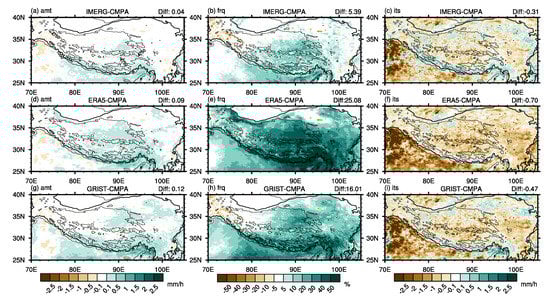 Though ERA5 and GRIST both show a strong pattern correlation with CMPA, these two obviously overestimated the amount (Figure 2g,j) and frequency (Figure 2h,k) over South Asia to the South of Himalaya and the southeastern part of TP, while underestimating the intensity across the whole study region (Figure 2i,l). The precipitation differences of precipitation estimated by IMERG, ERA5, and GRIST against CMPA are shown in Figure 3 separately. All simulation products indicate overestimates of the precipitation amount to a certain extent in the TP, with the most serious center mainly located in South Asia to the Himalayas. The average differences between IMERG and CMPA are 0.04 mm/h for precipitation amount, 5.39% for frequency, and −0.31 mm/h for intensity. ERA5’s precipitation amount bias (0.09 mm/h) is lower than that of IMERG, while its frequency (25.08%) and intensity (−0.7 mm/h) bias are far greater than those of IMERG (5.39% and −0.31 mm/h) and GRIST (16.01% and −0.47 mm/h). Comparing the two simulation results, ERA5’s and GRIST’s bias spatial distribution has similarities. Except for a significant overestimation of the precipitation amount along the Himalayas and the eastern edge of the TP, both datasets tend to overestimate the precipitation in the central TP. The overestimation is especially severe in regions with complex terrain. All of these amount’s wet biases mainly stem from an overestimation of frequency, with ERA5 and GRIST underestimating precipitation intensity in the study region, particularly in the south of the Himalayas and the central part of the TP. Furthermore, ERA5 and GRIST overestimate the precipitation intensity along the Himalayas to varying extents.
