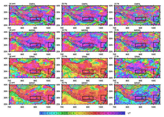 Spatial distribution of the diurnal peaks (LT, left: amount, middle: frequency, right: intensity) derived from CMPA (a–c), IMERG (d–f), ERA5 (g–i), and GRIST (j–l). The pentagram indicates the location of Lhasa. The thick black contour depicts terrain heights of 2000 m, and the thin black contours represent 1000 and 4750 m.
