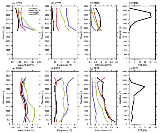 Figure 7 shows the elevation dependence of precipitation amount, frequency, and intensity in the YTRV and EPTP regions. In YTRV, the two simulation datasets consistently overestimate the amount and frequency of precipitation at all elevations compared to CMPA (Figure 7a,b), whereas they all underestimate the intensity, except at 3000–3500 m (Figure 7c). Comparing IMERG and the two simulation datasets to CMPA, the deviation of the IMERG (red line and dots) precipitation is minimal at almost all heights. ERA5’s (violet line and dots) bias in frequency and intensity is the most severe at all heights; However, below 5000 m, GRIST (green line and dots) has the most significant deviation in precipitation amount. The probability distribution function (PDF) of elevation in YTRV is shown in Figure 7d. Most grids (81.6%) have an elevation between 4500 and 5500 m, whereas just 0.3% (5 grids) have an elevation between 3000 and 3500 m. Therefore, only the grids over 3500 m in YTRV are discussed. The amount and frequency of CMPA (black line and dots) peak between 4000 and 4500 m, while the intensity peaks at low altitudes; and all three variables decrease as altitude rises. Differing from CMPA, IMERG’s precipitation frequency increases as elevation rises and reaches a maximum between 5000 and 5500 m. Though ERA5’s rainfall intensity varies little with altitude, ERA5 and GRIST can reproduce the relationship between precipitation and altitude changes in YTRV.