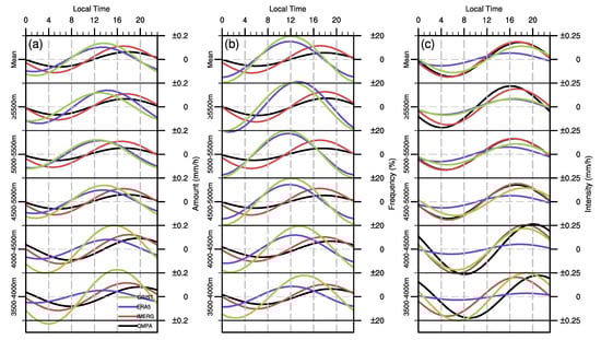 With increasing elevation, the diurnal phase of precipitation amount, frequency, and intensity in CMPA transitioned from midnight to evening in EPTP (from 0 to 18 LT for amount, from 23 to 18 LT for frequency, and from 23 to 19 LT for intensity; Figure 9a–c). IMERG has the same characteristics as CMPA, but the diurnal phase is 1–3 h earlier, and the higher the altitude, the more pronounced this earlier characteristic becomes. Although ERA5 can simulate the midnight peak of amount and intensity below 2000 m, its forenoon (amount and frequency) or early morning (intensity) peak time in the region above 2000 m is dramatically different from CMPA and IMERG. Therefore, there is still a significant deviation in the simulation of the diurnal phase of precipitation in EPTP by ERA5. The characteristic that the diurnal phase of precipitation increases with altitude can be simulated by GRIST. The variations of the amount, frequency, and intensity’s diurnal phases with increases in altitude are from 21 to 12 LT, from 14 to 12 LT, and from 19 to 17 LT, respectively, and all occur earlier than CMPA with the maximum biases appearing at 2000–3000 m. Even so, the bias of GRIST intensity’s diurnal phase is relatively tiny, occurring no more than 2 h earlier than CMPA.