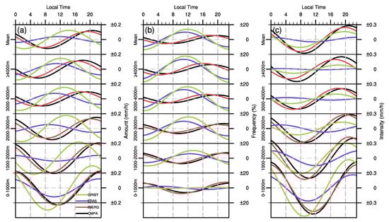Elevation dependence of the diurnal harmonic of precipitation variables ((a) amount (mm/h); (b) frequency (%); (c) intensity (mm/h)) in YTRV. Horizontal solid black lines separate different altitude blocks, and the horizontal dashed gray line in the center of each block marks the zero line. The altitude of each block increases from bottom to top, with the mean diurnal harmonic of YTRV displayed in the block at the top. The labels on the right Y-axis represent the values of the diurnal harmonic curve, with positive (negative) values above (below) the zero line (negative). The labels on the left Y-axis indicate the altitude intervals represented by each subgraph. The X-axis indicates the hour (local time) of the 24-h rainfall cycle. Black stands in for the CMPA dataset, red for IMERG, violet for ERA5, and green for GRIST.