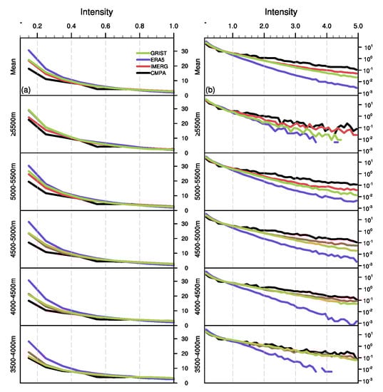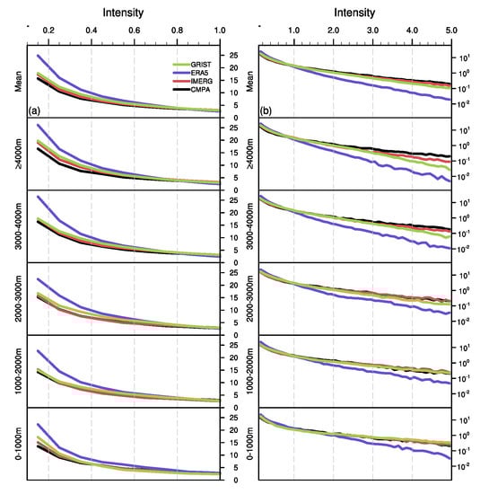The frequency–intensity distribution is a critical element of climatological rainfall features and a crucial metric for assessing model competence [23]. Figure 10 and Figure 11 present the precipitation frequency–intensity structure at various altitudes averaged in YTRV and EPTP; the altitude bins are the same as Figure 8 and Figure 9, respectively. The precipitation frequency distribution for weak intensities (0.1–1 mm/h) is shown in the left column, and the frequency distribution for all intensities (0.1–5 mm/h) is shown in the right column with logarithmic coordinates. The bias in the precipitation intensity structure is a prevalent issue in climate models [23,54,55], where light precipitation is overestimated and heavy precipitation is underestimated The hourly frequencies of all three datasets are more than that of CMPA (black line) for intensities less than 0.7 mm/h (Figure 10a and Figure 11a) and less than that of CMPA for intensities greater than 1 mm/h (Figure 10b and Figure 11b). In YTRV and EPTP, the frequency of CMPA heavy precipitation varies little with height, whereas the frequency of light precipitation increases somewhat with altitude. The frequency–intensity structure of IMERG is the most similar to that of CMPA, followed by GRIST, while ERA5 is the worst. For these three datasets, the frequency of heavy precipitation reduces with height, and the increase of light rain with altitude is more pronounced than that of CMPA. Consequently, in the two studied sub-regions, the precipitation frequency–intensity structures of the three datasets are more consistent with CMPA at relatively lower altitudes, and the overestimation of the weak precipitation and the underestimation of the heavy rainfall become more apparent as the altitude increases.