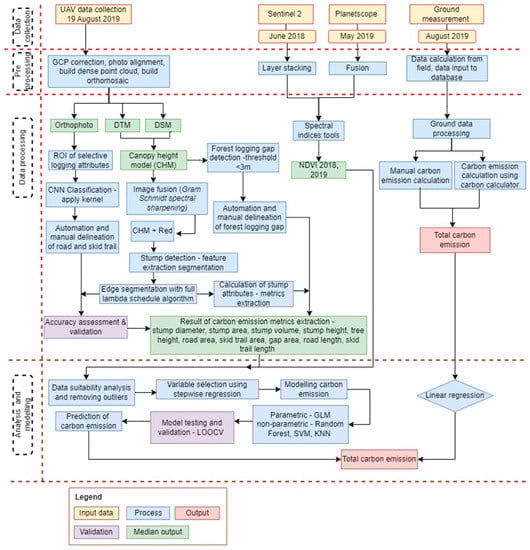 - Siti-Nor-Maizah, S.; Wan-Shafrina, W.M.J.; Khairul-Nizam, A.M.; Aisyah-Marliza, M.K.; Hamdan, O. Determination of Emission Factor from Logging Operations in Ulu Jelai Forest Reserve, Pahang using the Integration of UAV and High-Resolution Imageries. J. Trop. For. Sci. 2022, 34, 247–257. [Google Scholar] [CrossRef]