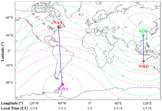 The propagation paths of the NAA signal to the GWS and the NWC signal to the SZS. The red triangles mark the transmitters, and the pink and green circles mark the receiving stations. The propagation path is illustrated using the blue line between the transmitter and receiving station. The pink dashed lines are the auxiliary line centered at GWS and separated by 2000 km, and the green dashed lines are the auxiliary line centered at SZS and separated by 2000 km.