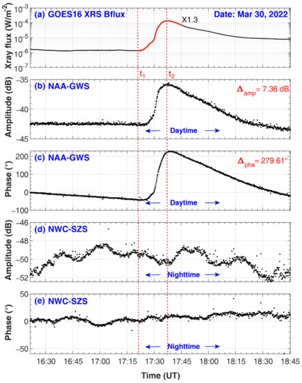 Responses of VLF signals to the X1.3 solar flare event on 30 March 2022, (a) the variation of X-ray flux, (b,c) the amplitude and phase of NAA signals observed at the GWS station, and (d,e) the amplitude and phase of NWC signals observed at the SZS station.