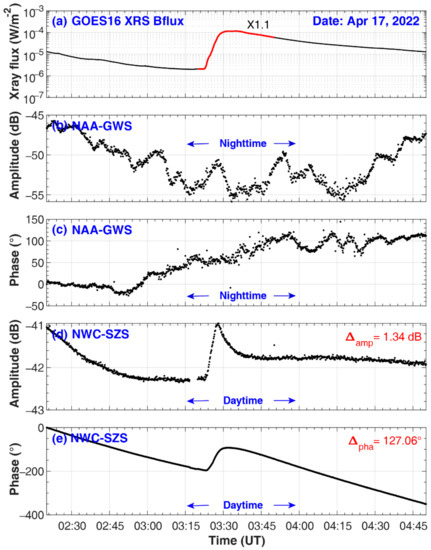 To further illustrate the difference between the daytime and nighttime propagation paths, the X1.1 class solar flare event, occurring at ~03:30 UT on 17 April 2022, is also investigated in this study. Different from the first case, the NWC-SZS propagation path was under local daytime conditions when the solar flare occurred, while the NAA-GWS propagation path was under local nighttime conditions. As shown in Figure 3a, the X-ray flux gradually decreased until ~03:20 UT and then increased from ~10−6 W/m−2 to ~10−4 W/m−2 during ~03:20–03:35 UT. As shown in Figure 3, the amplitude and phase of the NAA signal show little correlation with this solar flare, while those of the NWC signal have increased by ~1.34 dB and ~127.06°, respectively. This X-class solar flare occurred from ~11:20 to ~11:35 LT in the NWC-SZS path and from ~23:20 to 23:35 LT in the NAA-GWS path. We have only observed a clear change in VLF transmitter signals for the NWC-SZS path. This proves that the solar flare only influences the daytime propagation path and has little or no impact on the nighttime propagation path.