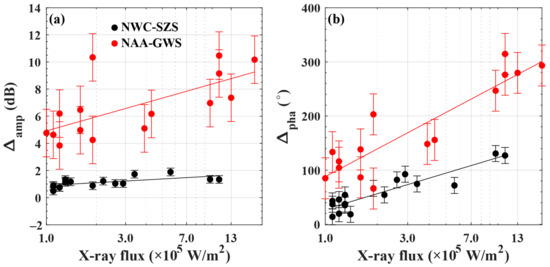This study further examines the relationship between the VLF response and the magnitude of solar flares at GWS and SZS, respectively. As shown in Figure 4, the x-axis represents the log-10-based X-ray fluxes corresponding to the different solar flare classes listed in Table 1 for all solar flare events. The red and black dots indicate the changes in amplitude (Figure 4a) and phase (Figure 4b) of the NAA and NWC signals, respectively. For both amplitude and phase variations, error bars show the uncertainty of each data point relative to the best-fit line [42]. For the NAA signals, the amplitude change caused by the ~M1.0 solar flare is ~5 dB, while it is ~8.5 dB for an X1.0 flare event. On the other hand, the phase change is ~80° and 250° for the M1.0 and X1.0 flare events, respectively. The amplitude and phase perturbation of the VLF signal increase with the magnitude of solar flares, and a more-intense solar flare has a more obvious influence on the propagation of VLF signals. For solar flares with the same magnitude, the responses of the NAA transmitter signals are stronger than the NWC signals. The relation between amplitude change and logarithm-based X-ray fluxes can be best fitted using linear functions. We assume a simple function ΔAmp = A log10(flux) + B to approximate the amplitude and phase change produced by solar flares, similar to that used in [22,23]. Based on the uncertainty of each point, the uncertainties in the two parameters of the best-fit line can be evaluated. The best-fit functions that we found for the amplitude variation are ΔAmp = (1.57 ± 0.65)log10(flux) + (6.72 ± 0.09) and ΔAmp = (0.23 ± 0.10)log10(flux) + (1.12 ± 0.02) for the NAA-GWS and NWC-SZS path, respectively. The slope of amplitude variation of the NAA signals is about seven times larger than that of the NWC signals, which indicates that the NAA signal is more sensitive to solar flare than the NWC signals. As for the phase measurements, the best-fit linear functions are Δpha = (77 ± 14)log10(flux) + (176.5 ± 1.8) and Δpha = (31.4 ± 5.1)log10(flux) + (59.1 ± 1.2), respectively. The fitted results indicate the increases in the NAA signals are more pronounced than those of the NWC signals. The VLF signal disturbance is linearly correlated with the solar flare magnitude, expressed as the logarithm of the X-ray flux, which is consistent with previous studies [21,22].