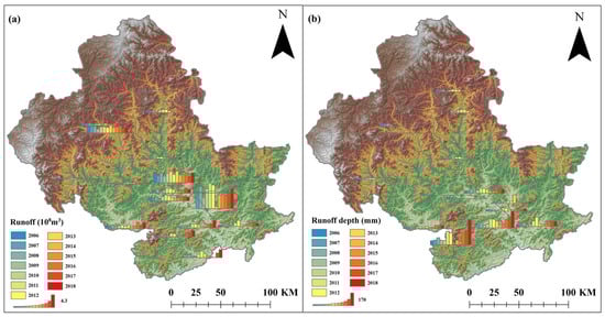 Annual spatial distribution of runoff and runoff depth. (a) and (b) were the spatial distribution for annual runoff and annual runoff depth, respectively.