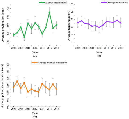Annual change of climate factors. (a), (b) and (c) were the annual average precipitation, temperature and potential evaporation, respectively.