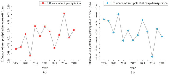 Budyko theory had been applied as a balanced interpretation of river climate elasticity successfully [67]. The analytical framework developed based on the Budyko curve determined the runoff sensitivity to potential evaporation, precipitation and catchment characteristics well in Australia [68]. In this study, the parameter ω = 1.3121 in Budyko’s hypothesis theory. The watershed runoff sensitivity coefficient to precipitation ranged from 0.674 to 0.783 and the multi-year average sensitivity coefficient was 0.724 (Figure 6a) according to Formulas (5) and (6). This indicated that the runoff of the basin was sensitive to rainfall. When the rainfall increased by 1mm, the runoff depth would increase by 0.724 mm during 2006–2018. However, the annual runoff sensitivity to rainfall fluctuated and its change trend was roughly consistent with precipitation in this basin (Figure 6a). In addition, the multi-year average runoff sensitivity coefficient to potential evaporation was −0.069 and the range of the sensitivity coefficient was −0.100 to −0.049. The result conveyed that the runoff depth decreased by an average of 0.069 mm when the potential evaporation increased by 1 mm in this study area. In addition, it could be found that the variation trend of the runoff sensitivity coefficient to precipitation was just opposite to that of runoff to potential evaporation (Figure 6). Because the increment of precipitation increased the watershed runoff, the increase of potential evaporation changed surface water from liquid into gas and reduced watershed runoff [69].