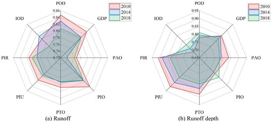 Previous research pointed out that socioeconomic development and human activities affected the underlying surface structure and hydrological process of the watershed to a certain extent, thus impacting the runoff [70]. High population density, rapid socioeconomic development and urbanization impacted the surface water and belowground water a lot in this region. The residential, industrial and agricultural water usage were affected as well [14]. It can be learnt that population density (POD) had the highest correlation degrees with runoff compared with other socioeconomic development indicators in 2010 and 2014 (Figure 7). Although it decreased from 0.847 in 2010 to 0.807 in 2018, it was still the second highest correlation degree, which was only second to per capita industrial output value (PIO). It indicated that the high population density and the relative human activities were an important aspect that affected watershed runoff during socioeconomic development, although the impact became weak in the later period. The higher population density increased the proportion of impervious surface, thus inhibiting the water infiltration, increasing the runoff, and increasing the urban flood risk as well [71,72]. Thus, the permeable ground could be constructed to mitigate flood risk caused by the urban surface runoff to a certain extent [73]. The correlation degree between runoff and PIO in 2010 and 2014 was second only to that of POD and it was the highest among all the socioeconomic indicators in 2018. This was because industrial activities such as industrial water use, industrial land development and industrial population gathering affected the hydrodynamic field and fluctuated the groundwater level [74].