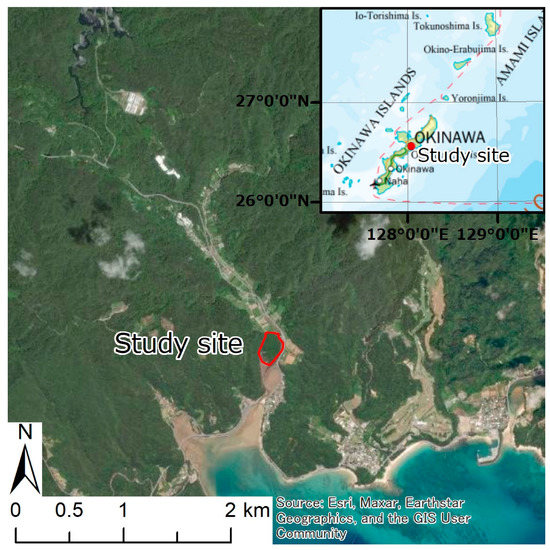 The research was conducted in a mangrove forest near the mouth of the Oura River in Aza-Oura, Nago City, and Okinawa Prefecture, Japan (Figure 1). The mangrove forest is approximately 4.6 ha in size, and is dominated mostly by Bruguiera gymnorhiza, with the shrub Kandelia obovata distributed along the mangrove forest edges bordering the stream channel. The mangrove forest of the Oura River is one of the mangrove forests in the northern limit of distribution [21], the largest and healthiest on Okinawa’s main island [22]. Evaluating the changes since 2015, no major human alterations were observed except for the construction of a tourist walkway on the west side of the mangrove forest (Figure 2). There are indications that canopy density has increased. The Oura River mangrove forest has been designated as a natural monument by Nago City and as an important wetland by the Ministry of the Environment, and they are considered an important site for the conservation of mangrove forests on Okinawa’s main island.