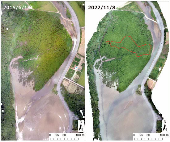 Changes in mangrove forests; comparison of orthomosaic images using UAVs. The red boundary is the validation area (4783 m2).
