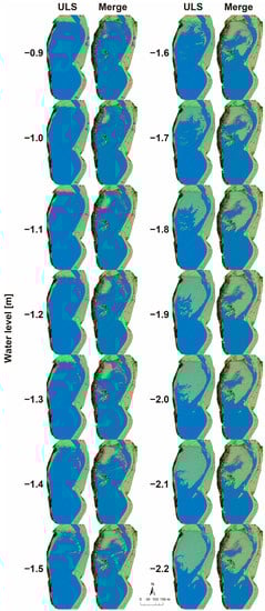 TLS, ULS, and Merge-generated DTMs were compared (Figure 3). TLS was used to measure the micro topography of the heaps of Thalassina anomala and the forest floor, but it cannot reproduce the topography in some areas, such as the area where the shrub K. Obovata was widely dispersed, and it could not be traversed. ULS could measure a larger area, including areas that TLS was unable to traverse, but could not reproduce the microtopography and heaps of T. anomala. Merge could generate a broad topographic map, including the heaps of T. anomala and microtopography of the forest floor, filling in the gaps left by the TLS. The results of a simple tidal simulation with water levels varying at 10 cm intervals are shown using ULS and Merge’s DTM (Figure 4). Merge could replicate the effects of the heaps of T. anomala and microtopography of the forest floor. ULS could only reproduce the major trends in tidal fluctuations.