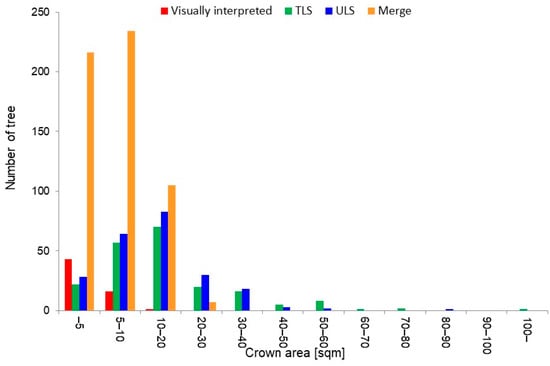 The number of crowns classified by TLS and ULS was approximately one fourth of the total number of visual identification results, whereas the number of crowns classified by Merge was 61% of the total number visual identification results (Table 1). Merge was most similar to the visual identification distribution of canopy area (Figure 7), whereas TLS and ULS had more canopies with larger area than visual identification (Figure 8).