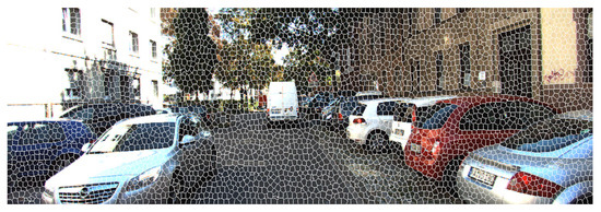 The size of the point cloud obtained by stereo matching is usually very large, and it inevitably contains some outliers and invalid value points due to mismatching or distance. Therefore, point cloud filtering [30] is used to preprocess it and improve the quality of the point cloud while reducing the data size. In order to calculate the local spatial feature of the point cloud, this paper adopts the SLIC algorithm [31] to perform superpixel segmentation on the image, and takes the superpixels as the smallest detection unit. The segmentation result of the SLIC algorithm is shown in Figure 2. This algorithm is different from the simple rectangular superpixel segmentation. It can better retain the contour information of the image and make the pixels in the superpixel come from the same object as much as possible. In addition, the SLIC algorithm can reduce the difference in the depth of the point cloud from the same superpixel, which is beneficial to the subsequent plane fitting.