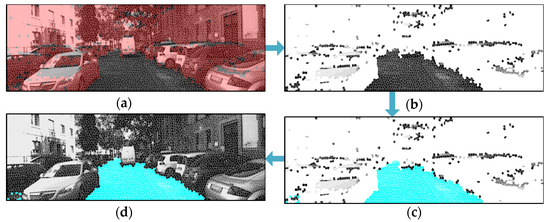Flow chart of fitting road plane in OD-SPH method: (a) Segmentation result of OD-PNV method; (b) Extracted free space area (gray area); (c) Fitting result of road plane (blue area); (d) Display of road plane in the original image.