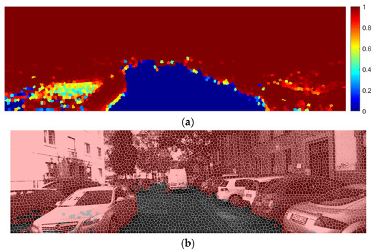 Figure 8 shows the probabilistic distribution of the above image, represented by , and the classification result of the OD-SPH method (the decision threshold is set to 0.15). As can be seen from the figure, as is obtained from the height of the superpixel point cloud, there is no misjudgment in the obstacle area with a plane geometry, such as the hood of the vehicle. These areas are classified as the obstacle in Figure 8b, and this method makes up for the shortcoming of the OD-PNV method. However, in some areas close to the road surface (such as vehicle tires), the OD-SPH method has the problem of low discrimination, while the OD-PNV method does not have such a problem. Therefore, the fusion of these two methods can achieve complementary effects.