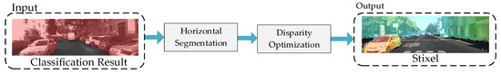 Stixels are a superpixel environment description model based on the observation that geometries in an artificial environment are mainly composed of planes. A single stixel is defined as a thin earthbound rectangle with a fixed pixel width and vertical pose [10]. When describing the traffic scene, the stixel shows high accuracy and flexibility, and can compress the output data size, which is particularly suitable for the artificial environment mainly composed of horizontal and vertical structures. In this paper, the stixel includes four attributes: width, base point, top point and depth. The width is the pixel width of the stixel, the base point and the top point mark the beginning and end of each stixel, and the depth represents the distance between the stixel and the camera. On the basis of reference [10], SGA-SO is proposed in this paper. According to the features of the output result of the obstacle detection method proposed in this paper, SGA-SO is divided into two parts: horizontal segmentation and disparity optimization. SGA-SO first performs a column-by-column horizontal segmentation of obstacle superpixels according to a fixed width, and then further optimizes the initially segmented stixels. Figure 10 is the flow chart of SGA-SO.