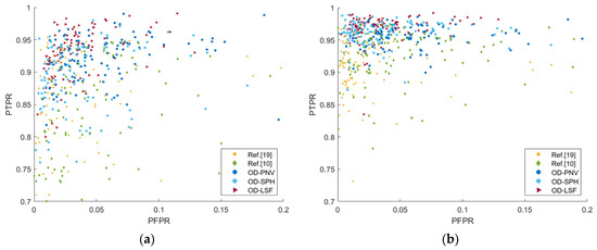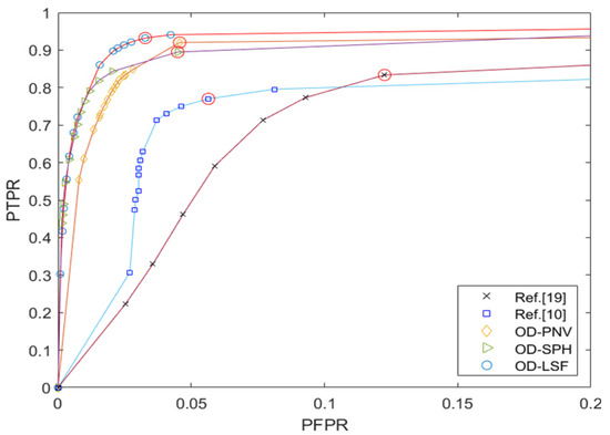 Figure 13 shows the PTPR over PFPR scatter plots of the five methods under the two obstacle classification standards. A high PTPR and low PFPR (upper left corner of the figure) can reflect the best detection performance. It can be seen from the figure that the points of the OD-LSF method under the two obstacle classification standards are closer to the upper left corner of the figure than the other four methods, and the distribution of the points is more concentrated. This indicates that the OD-LSF method not only performs better in terms of its detection performance, but also is stronger than the other methods in terms of its stability.