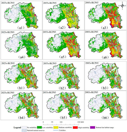 3.4. Potentially Suitable Areas for Asian Elephants in Sipsongpanna under Different Future Climate Scenarios