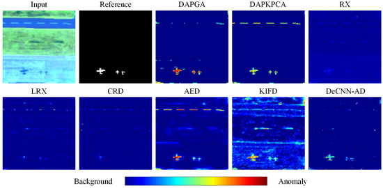 The pseudocolor image, reference map and detection maps of the methods using the Gulfport airport dataset.