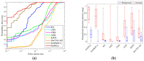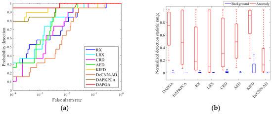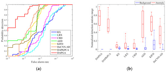 ROC curves and box plots of the methods using the Gulfport airport dataset: (a) receiver operating characteristic (ROC) curves; (b) background–target separability maps.