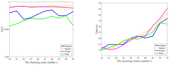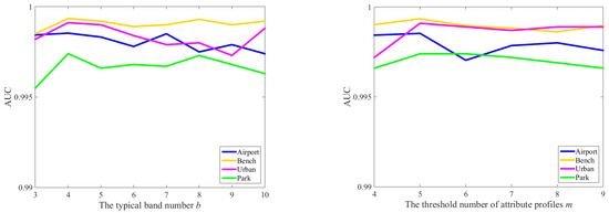 The influence of various parameters on the detection performance of the DAPGA method is analyzed in this section. The parameters contain the reserved typical band number b in band selection, the threshold number of attribute profiles m and the clustering center number n, representing the number of optimal DAPs. Figure 12 exhibits the effect of the parameters b, m and n over the AUC scores and running time of the DAPGA method on each dataset. When analyzing one of the parameters, the others will be set as default parameters b = 4, m = 5 and n = 40. As depicted in the top left of Figure 12, the AUC values tend to be stable in most situations when the band number b is larger than four. The top right of Figure 12 shows the influence of threshold number m in each attribute type over the detection performance. The AUC curve reaches a peak when m is equal to five and is generally smooth and stable. It means that the selection of a threshold number may have little impact on detection performance when the threshold number is greater than five. As shown in the bottom subfigures, the optimal number n of clustering centers for each dataset is quite different. In general, the DAPGA method demonstrates good detection performance when n is in the range of thirty-five to forty-five. Additionally, the computing time increases rapidly with the clustering center number n.