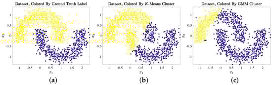 Though classical clustering algorithms such as K-Means and the Gaussian Mixture Model (GMM) [] remain widely used in practice, these algorithms tend to perform poorly on HSIs for a number of reasons [,]. First, algorithms that rely on Euclidean distances are prone to the “curse of dimensionality” on datasets like HSIs with a high ambient dimension (i.e., the number of spectral bands is large) []. Second, HSIs are often spectrally mixed [,,,], and overlap may exist between clusters in Euclidean space []. A final complication is that classical algorithms generally assume that latent clusters in a dataset are approximately ellipsoidal groups of points that are well-separated in Euclidean space [], but clusters in HSIs often exhibit nonlinear structure []. A simple toy dataset, visualized in Figure 1 [], serves as an example of a dataset with a nonlinear structure. This dataset lacks a linear decision boundary between its latent clusters, and classical algorithms (K-Means and GMM []) could not learn its latent nonlinear cluster structure. HSIs often contain clusters that can only be separated using a nonlinear decision boundary []; thus, algorithms that rely solely on Euclidean distances are expected to perform poorly at material clustering on HSIs.
