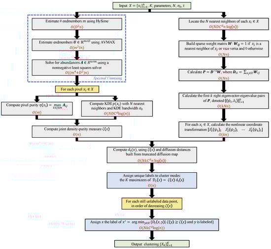 Diagram of the D-VIC clustering algorithm. The computational complexity of each step is colored in red. The scaling of D-VIC depends on n (no. pixels), D (no. spectral bands), m (no. endmembers), I (no. AVMAX maximizations), N (no. nearest neighbors), d (doubling dimension of X []), and C: a constant independent of all other parameters []; see Section 3.1 for details. Note that all steps are quasilinear with respect to n, implying that D-VIC scales well to large HSI datasets. We remark that the spectral unmixing step (indicated with a blue box) is quite modular, and other approaches may be used in future work [,,,,,,].