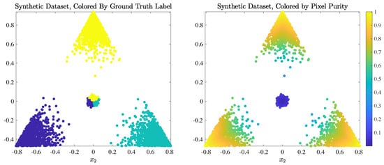 Ground truth labels and pixel purity of synthetic dataset sampled from a triangle in ; the vertices of this triangle served as ground truth endmembers. Notice that empirical density maximizers near the origin are also the lowest-purity data points.