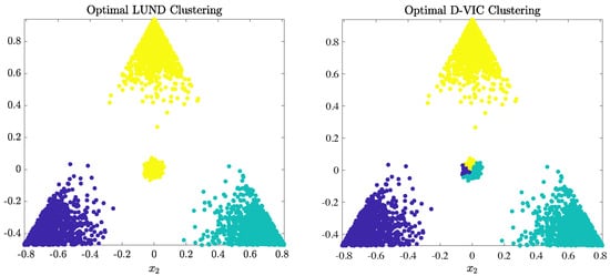 Optimal LUND (OA = 0.739) and D-VIC (OA = 0.905) clusterings of the synthetic dataset (Figure 3). D-VIC explicitly incorporates data purity into its labeling procedure, resulting in better clustering performance than LUND in the high-density, low-purity region near the origin.