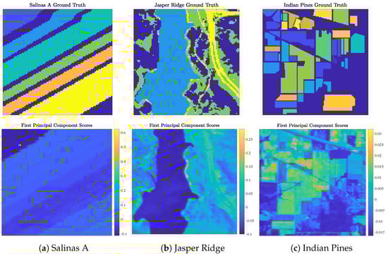 Ground truth labels and first principal component scores for the real benchmark HSIs analyzed in this article: Salinas A (a), Jasper Ridge (b), and Indian Pines (c).